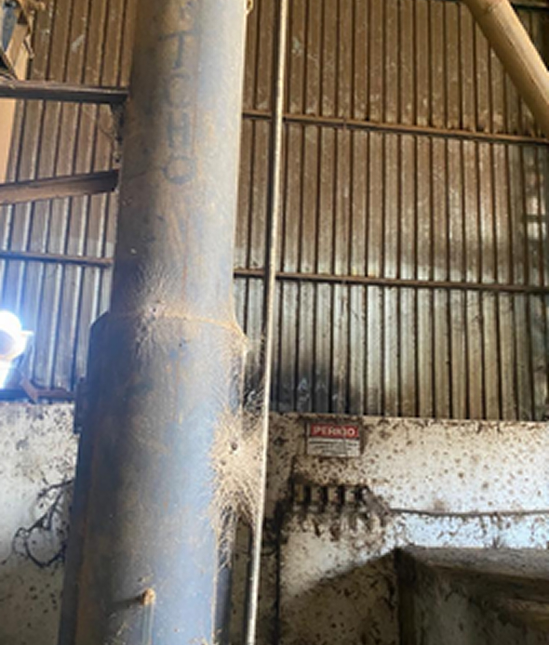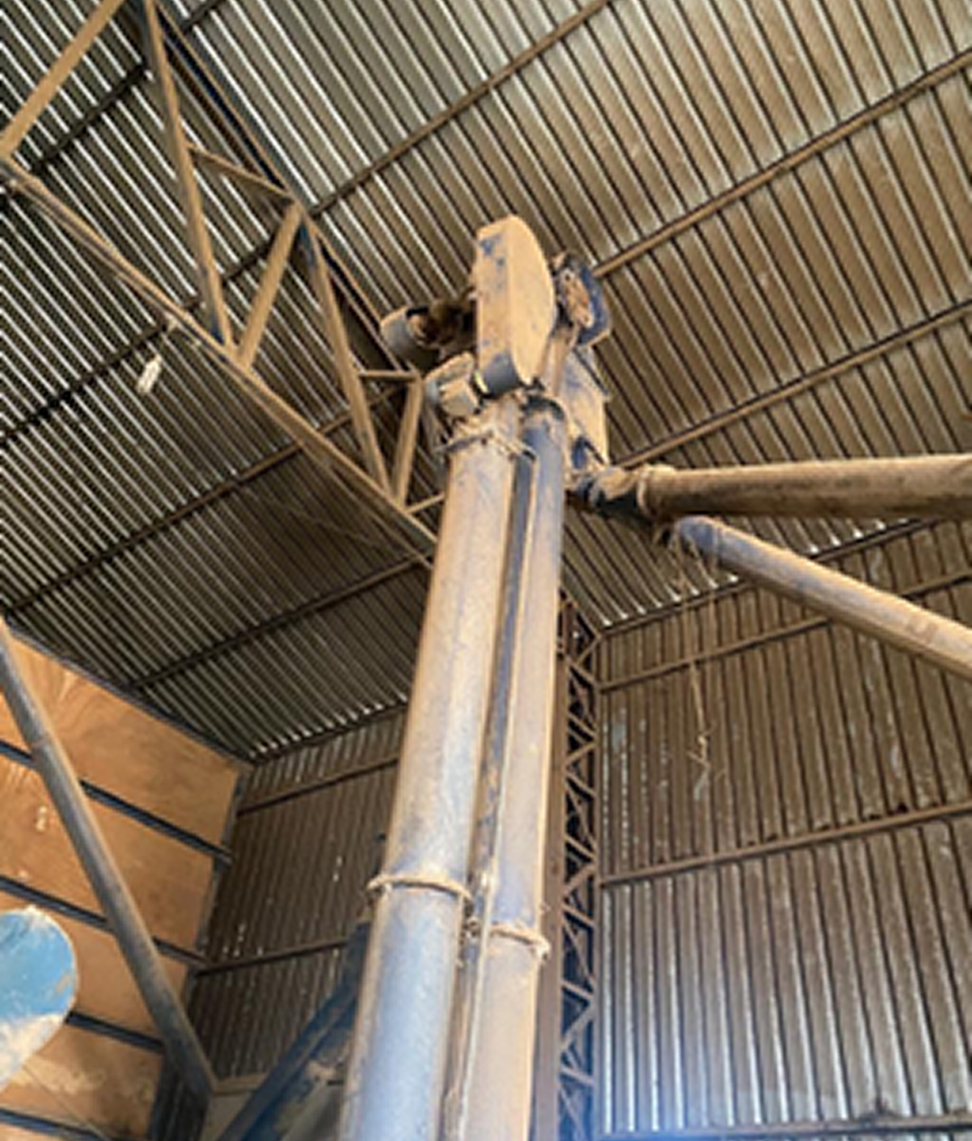 Elevador com correia, canecas e motor. Equipamento projetado para transporte vertical eficiente de grãos, oferecendo desempenho estável e construção resistente para uso contínuo.